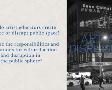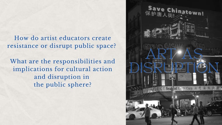 Presentation on critical public pedagogy, specifically the use of public space in relation to artistic disruption & rebuilding tactics.